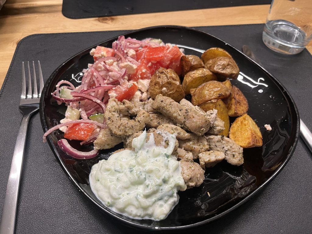 - Skera 800 g kartöflur í fernt og velta upp úr 2 msk olíu og 2 tsk bratkartoffel kryddi í stórri skál.