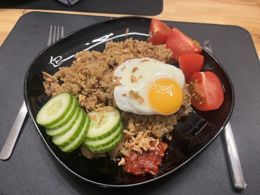Egg yfir kjúkling og grjón, svo gúrkur og tómatar til hliðar, strá yfir steiktum lauk og sambal oelek ef þetta á að vera sterkara.