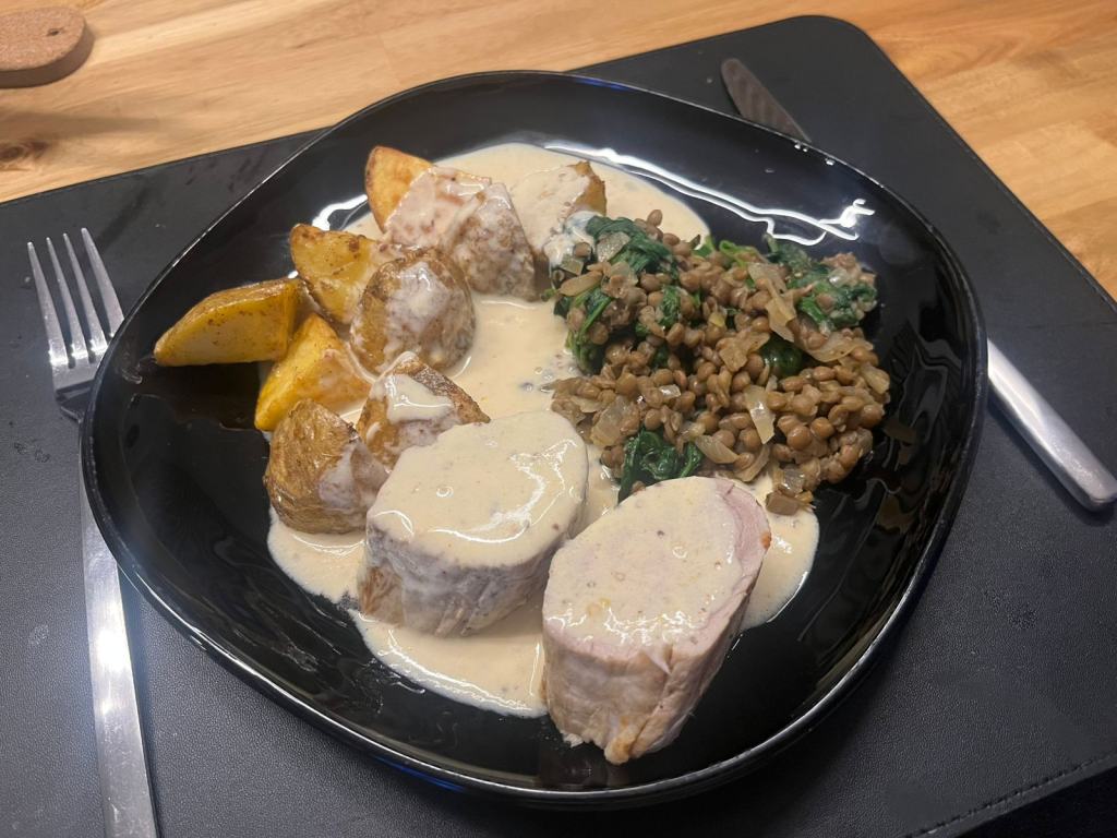 Svínalund, linsubaunir og grænmeti